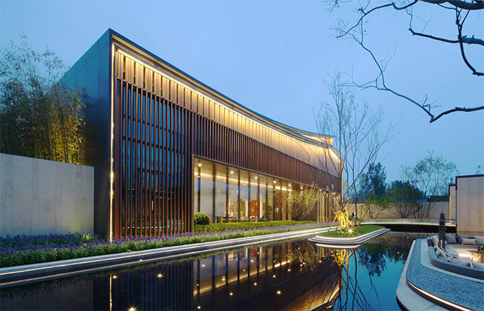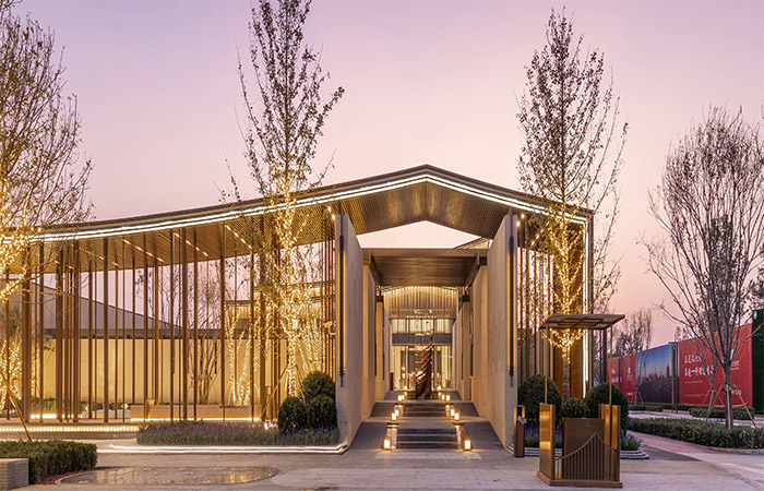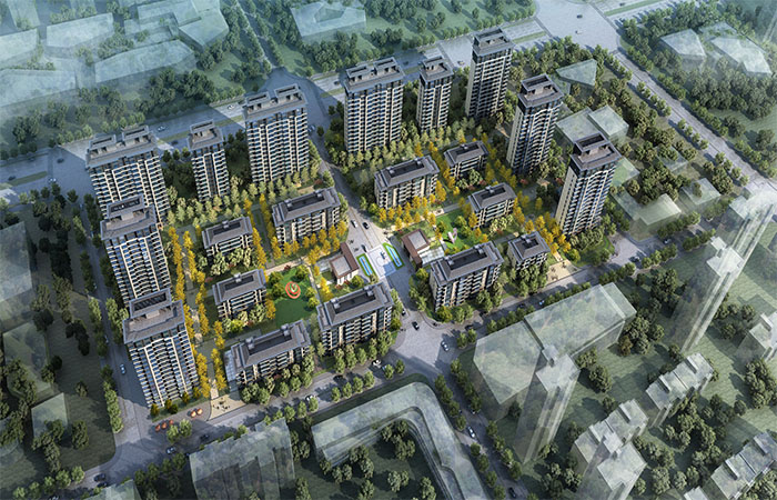 以薈萃城市頂級資源,引領城市未來居住所向為主旨。立面風格上,住宅以新中式風格為主調,形體上采用對稱的構圖,主體顏色采用米白色與淺灰色,整齊大氣的立面能夠規(guī)整城市沿街面,提升城市形象。