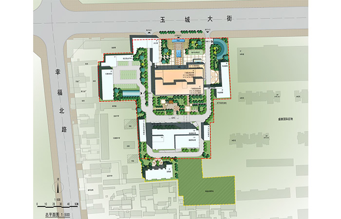 在總平面布局上,該設(shè)計(jì)主要以規(guī)整式布局為主,結(jié)合原有地形采用自然式布局,做到規(guī)整與自然式相結(jié)合,為病人提良好的就醫(yī)環(huán)境。本著合理安排資源和服務(wù)廣大人民群眾的基礎(chǔ)上,合理布局。新建門(mén)診醫(yī)技綜合樓位于整個(gè)地塊中部,北側(cè)規(guī)劃設(shè)計(jì)為開(kāi)敞廣場(chǎng)并與道路相連,西側(cè)為行唐縣急救站,東側(cè)為傳染病樓,南側(cè)為病房樓。