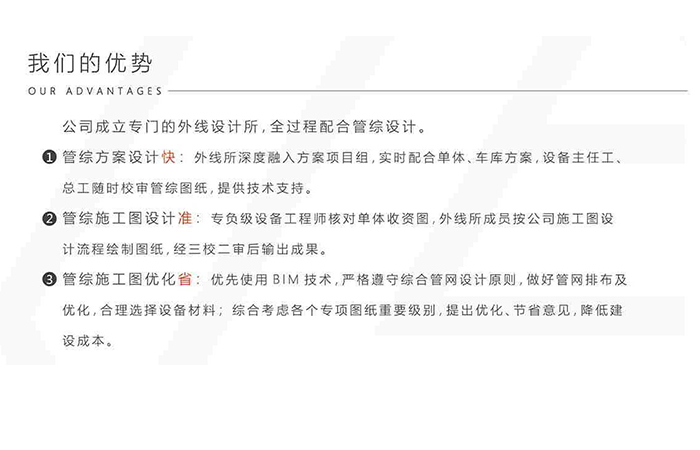施工圖管綜優(yōu)化:配合燃氣管網(wǎng)、通信管網(wǎng)、自來水管網(wǎng)、景觀等專項設(shè)計,綜合調(diào)整、優(yōu)化各專項圖紙,提升項目整體景觀展示效果,控制成本。