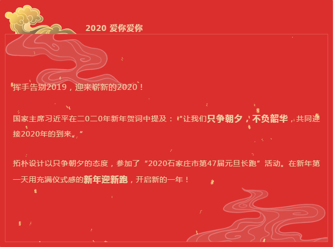 毛總寄語說到:“希望大家在新的一年身體健壯,精力飽滿,健康生活。在奮力工作的同時保證身體健康和生活品質(zhì),這是拓樸設(shè)計一直以來希望戰(zhàn)友們所追求的,畢竟身體健康才是一切的根本。新年新希望,我們大家一起努力,一起奮斗!”