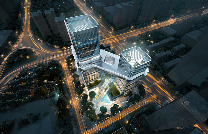 ? ? 雙子塔樓:塔樓整體采用修長(zhǎng)的建筑線條勾勒形體,采用幾何分段式強(qiáng)調(diào)建筑垂拔高聳的公建姿態(tài);轉(zhuǎn)角部采用內(nèi)凹收分,摹畫建筑修長(zhǎng)體型;頂部采用舒展的切面開合,塑造建筑挺拔上升質(zhì)感;材質(zhì)上采用不同通透率的玻璃幕墻強(qiáng)調(diào)建筑體量美感。
