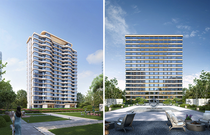 建筑立面上為體現(xiàn)立面的豐富性,分區(qū)設計。立面呼應潺潺流水意向,采用弧形優(yōu)雅曲線,追求建筑柔美靈動之感。綜合社區(qū)服務中心則在未來感與現(xiàn)代感的基礎上,注重增加動感和活力,彰顯時尚城市品位。