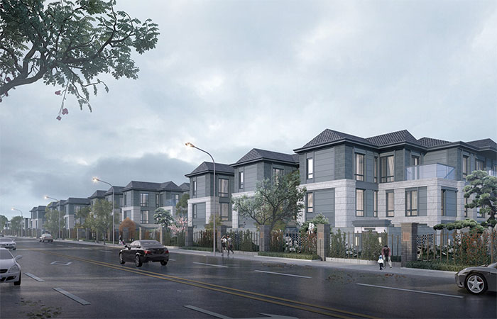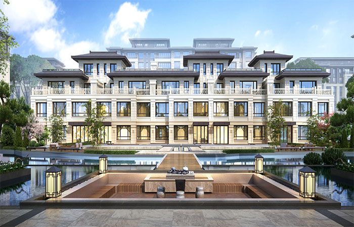 建筑風(fēng)格為新中式,立面顏色主要有灰色、深咖色、淺米色組成,設(shè)計優(yōu)雅大氣,富有格調(diào)。