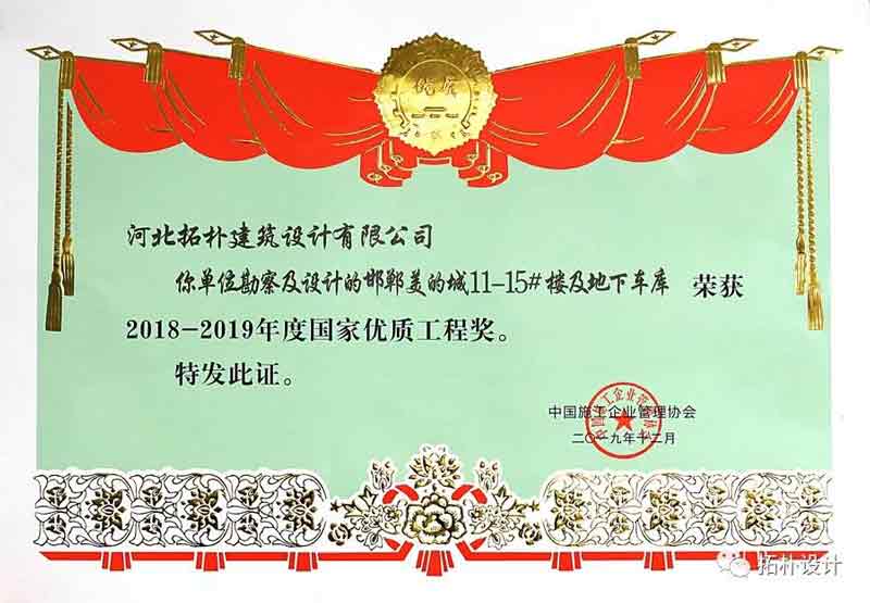國(guó)家優(yōu)質(zhì)工程獎(jiǎng)設(shè)立于1981年,是經(jīng)國(guó)務(wù)院確認(rèn)的我國(guó)工程建設(shè)領(lǐng)域設(shè)立最早,規(guī)格最高,跨行業(yè)、跨專業(yè)的國(guó)家級(jí)榮譽(yù)獎(jiǎng)勵(lì)。拓樸設(shè)計(jì)榮獲“國(guó)家優(yōu)質(zhì)工程獎(jiǎng)”獎(jiǎng)項(xiàng),倍感驕傲和自豪。此前,邯鄲美的城項(xiàng)目也曾榮獲河北省優(yōu)秀工程勘察設(shè)計(jì)獎(jiǎng)和中國(guó)土木工程詹天佑優(yōu)秀住宅小區(qū)獎(jiǎng)。拓樸設(shè)計(jì)初心依舊,砥礪前行!